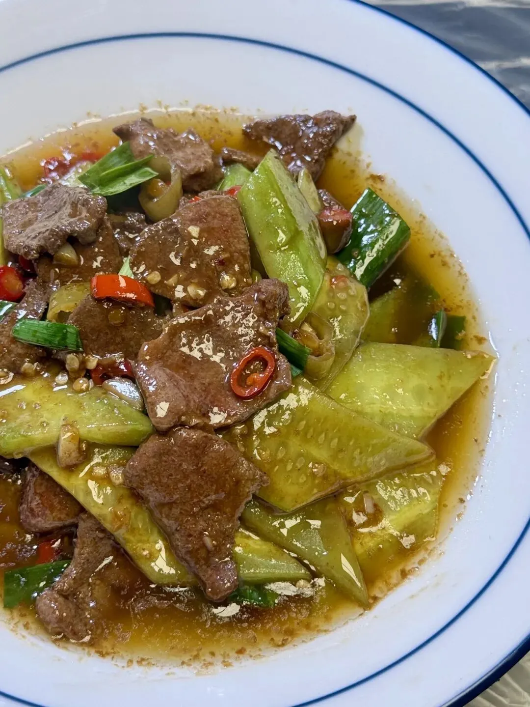 猪肝很新鲜,冲水也冲得干净,没有脏器味,炒得也比较嫩,感觉还微微泛红,黄瓜的清香也得以体现,能在菜中很好地起到解腻的作用。加上大蒜子和小米辣带来的香味和微辣,和最后起锅的时候放了点锅边醋,让这道菜口感和口味上都很有层次。只是用油量有些大,碗底积油太多,这是不太讨喜的,勉强推荐。