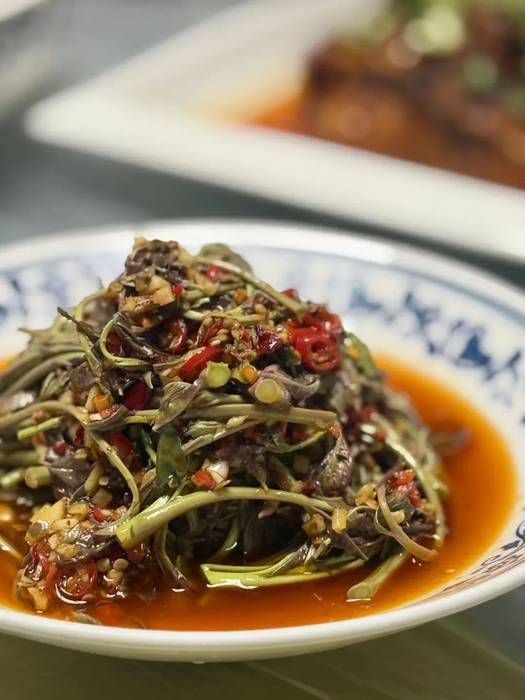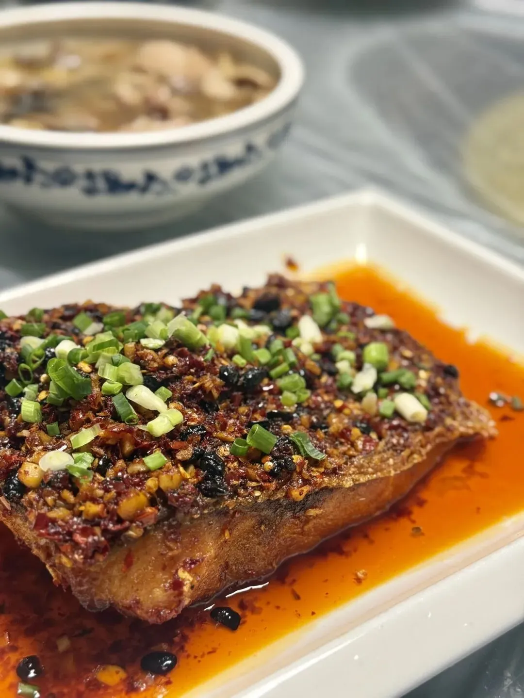 这块鱼的个头不小,腌制的时间也到位了,基本上形成了蒜瓣肉,店家采用了油炸的方式来烹饪这道菜,算得上是别具一格的做法,整块鱼肉在表面形成了一层酥壳,里面仍然保持着暴腌鱼该有的嫩度,一口下去口感丰富。加上豆豉辣椒提供香味和辣度,还有一点点的醋来提鲜,整体吃起来算是别有一番风味,这个推荐。