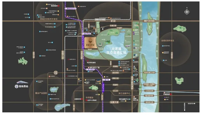 大泽湖构建“一桥一环三横三纵”内部交通网络的大交通格局,地铁4号线北延线吴家冲站(建设中)距离项目约400米,同时片区有地铁13号线(规划中)经过,高效畅达全城。