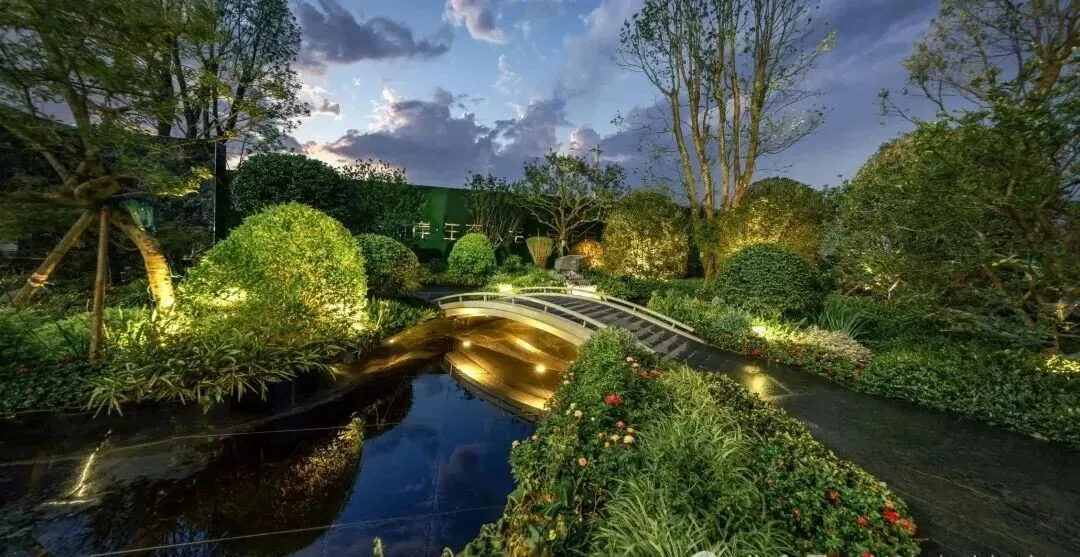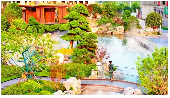 灵感源自王维“明月松间照,清泉石上流”的松韵桥,横跨水面,不仅连通两岸,更将 诗意水景浓缩于方寸。抬头可见“松涛问鲤”奇观:冠幅超6米的进口特级黑松枝干探水,仿佛与池中锦鲤互致问候,一桥两景,意趣盎然。