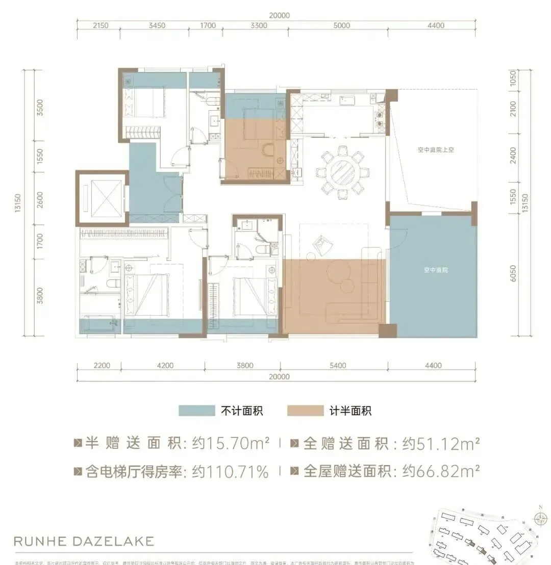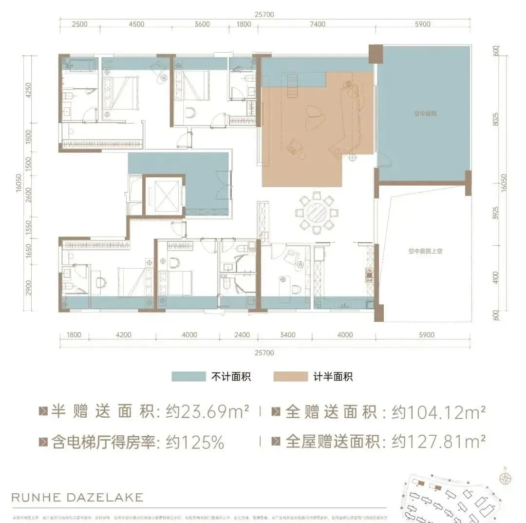 该户型在售楼栋,全部为两梯两户的独栋单元设计。打造了挑高6.2米的空中庭院,约25㎡面积全赠送。室内四房设计,双套房+两个客卧,共同组成入户十字玄关设计,开敞明亮。活动区端厅设计,客餐厨一体化+超大公共活动空间,空间几无浪费。同时,北向可瞰中心园林锦鲤池景观,闲暇时分,坐在空中花园中品品茶,看看书,眼睛疲了就瞰下园林景观、看一下池中锦鲤嬉游,不胜惬意。该户型在售楼栋位于小区中间,楼下正前方是中心园林锦鲤池,是景观视野最好的位置。同样为两梯两户的独栋单元设计,私密性与安全性兼具。约188㎡户型,同样挑高6.2米的空中庭院,约26㎡面积全赠送。室内四房布局,双套房+入户十字玄关,活动区端厅面积更大,空间尺度更舒服。划重点,这两个户型在得房率上更实在。两个户型全屋多享面积超70㎡,相当于多了一套旧规小户型,得房率达到110-114%。另外,楼盘还将推出一线临湖头排楼王,主推约270㎡空中院墅,目前正在认筹中。该户型层高约3.4米,空中花园挑高约6.8米,是长沙住宅类大平层尺度天花板。约13.4米大面宽,客厅开间约7.4米,花园面宽约6米,拥有超大采光与景观视野;五房两厅五卫布局,四套房设计,兼顾家庭所有成员需求,舒适性拉满。最值得一提的是该户型的得房率,将达到长沙平层住宅的极致。算一算:约51㎡空中花园全赠送,室内赠送约128㎡空间,实得使用面积约335㎡,算下来得房率高约125%(含电梯厅),性价比拉满。
