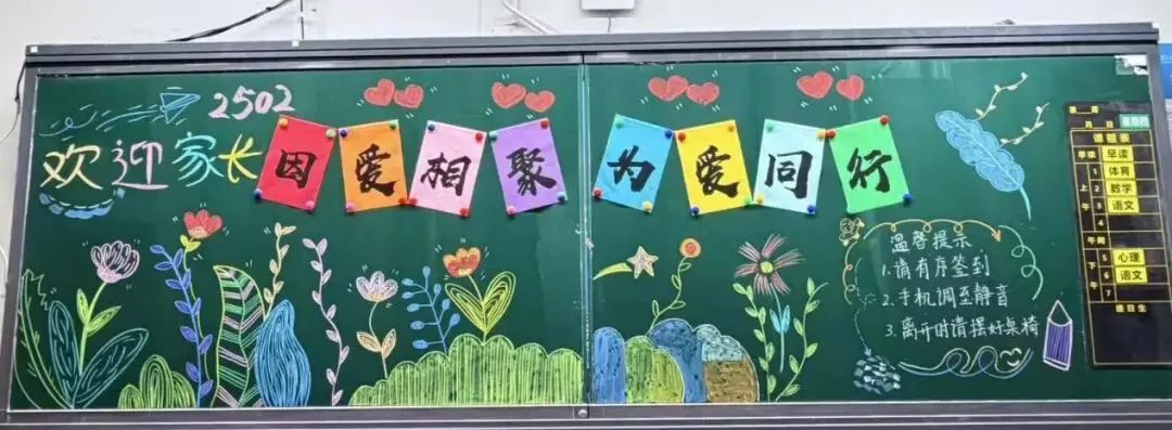 为了这场温暖的相聚,一年级各班老师提前精心布置了教室。色彩斑斓的黑板报上,“因爱相聚 为爱同行”的主题醒目又暖心,手绘的花草、可爱的装饰,每一处细节都饱含着对家长的欢迎与对孩子的爱。整洁的课桌椅、贴心的饮用水,让家长们一踏入教室,便感受到浓浓的暖意与诚意,为本次家长会拉开了温馨的序幕。