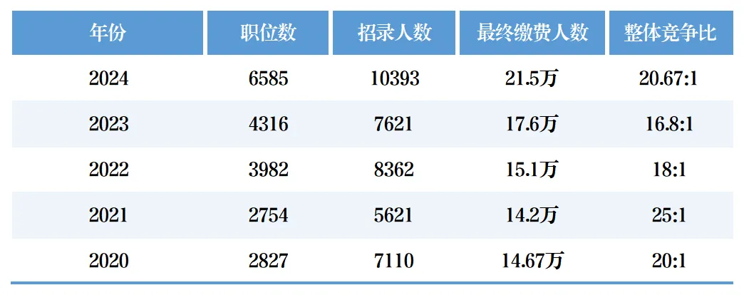 可以看出,2024年湖南省考招录人数是近五年最多的,最终通过报名缴费确认的人数有21.5万,综合竞争比达到了20.67:1。对于2025湖南省考,招录人数究竟会增多还是减少,我们拭目以待。