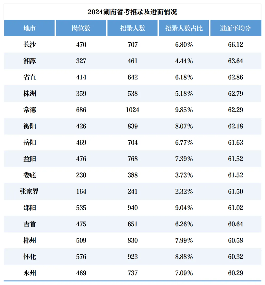湖南各地市的竞争情况有一定差别,以下为2024年湖南省考各地市招录情况及进面情况,来看看你心仪地市的进面分数~