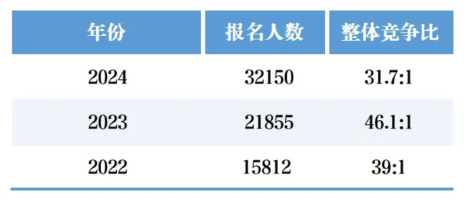 2024年,湖南省考长沙地区报名人数为32150人,较上年增长了10295,整体竞争比例为31.7∶1。