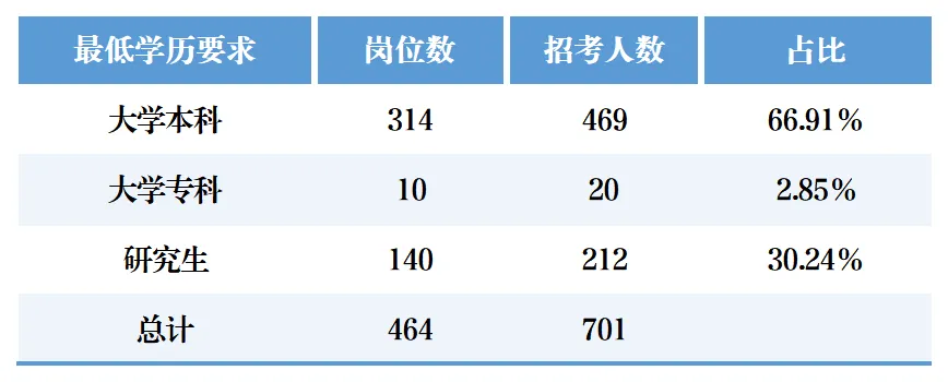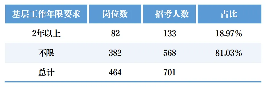 2024年省考招录共有81.03%职位对基层工作经历无限制,招录人数高达568人,应届生机会比较多。要求2年以上基层工作经历的职位只占18.97%。