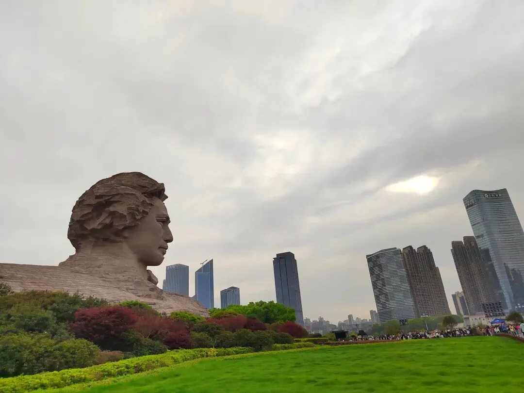 雕塑的朝向为东南方,这天清明天气本来阴沉着要下雨,可是霎那间东南方的天际却亮了起来,照亮了那座最高建筑“橘洲诺雅”,那座现代化的豪华酒店刚于2026年初运营。