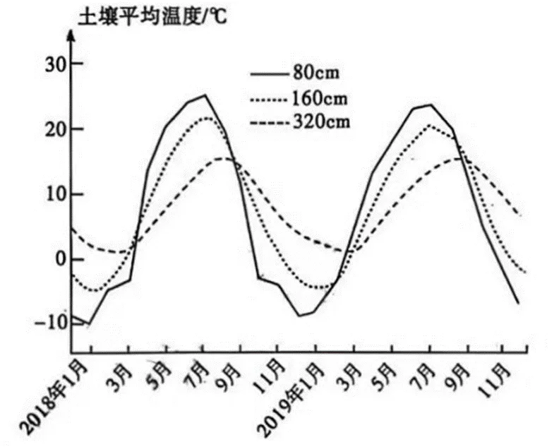 科尔沁沙地位于大兴安岭和冀北山地之间,是我国面积最大的沙地。科尔沁沙地坨甸相间,“坨”即固定、半固定及流动的沙丘(当地称为坨子地),沙丘多呈西北—东南走向的垄岗状,沙岗上广泛分布着榆树疏林;“甸”即相对低平的洼地(当地称为句子地),是牧民主要的放牧场所。科尔沁沙地土壤的最低温度,春、夏季出现在凌晨4:00前后,秋、冬季出现在22:00~23:00。下图示意2018——2019年科尔沁沙地不同深度土壤平均温度的变化。