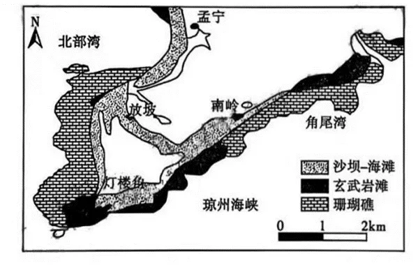 珊瑚礁的形成过程主要依赖造礁珊瑚虫分泌碳酸钙骨骼的长期堆积完成。珊瑚礁生态价值极高,能够保护海岸、净化海水。灯楼角(20°N,110°E)位于广东徐闻县西岸,雷州半岛西南端,是中国大陆唯一大面积珊瑚岸礁生长地,灯楼角地势低平,海岸与潮间带地质为沙滩和岸礁。由于潮间带养殖、水下海砂开采等,珊瑚礁不断退化。近年来,广东省不断推进珊瑚礁生态系统保护,并取得良好效果。下图为灯楼角区位示意图。