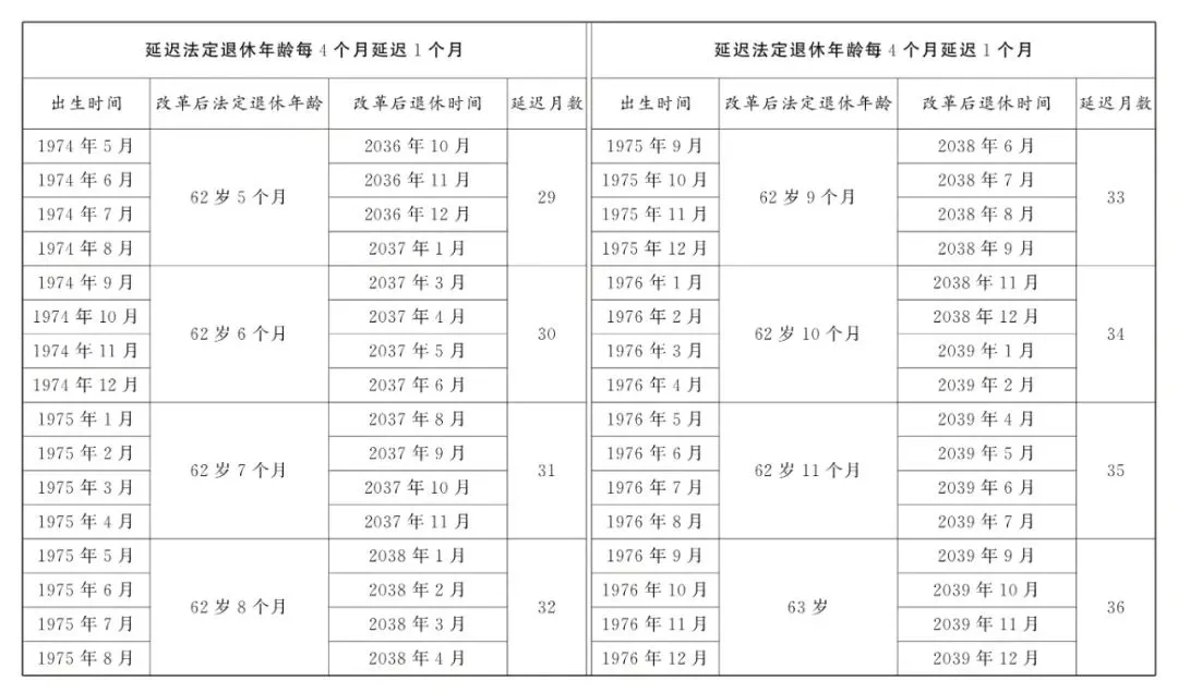 用15年时间,男职工的法定退休年龄逐步从原六十周岁延迟至六十三周岁,具体退休年龄见下表👇