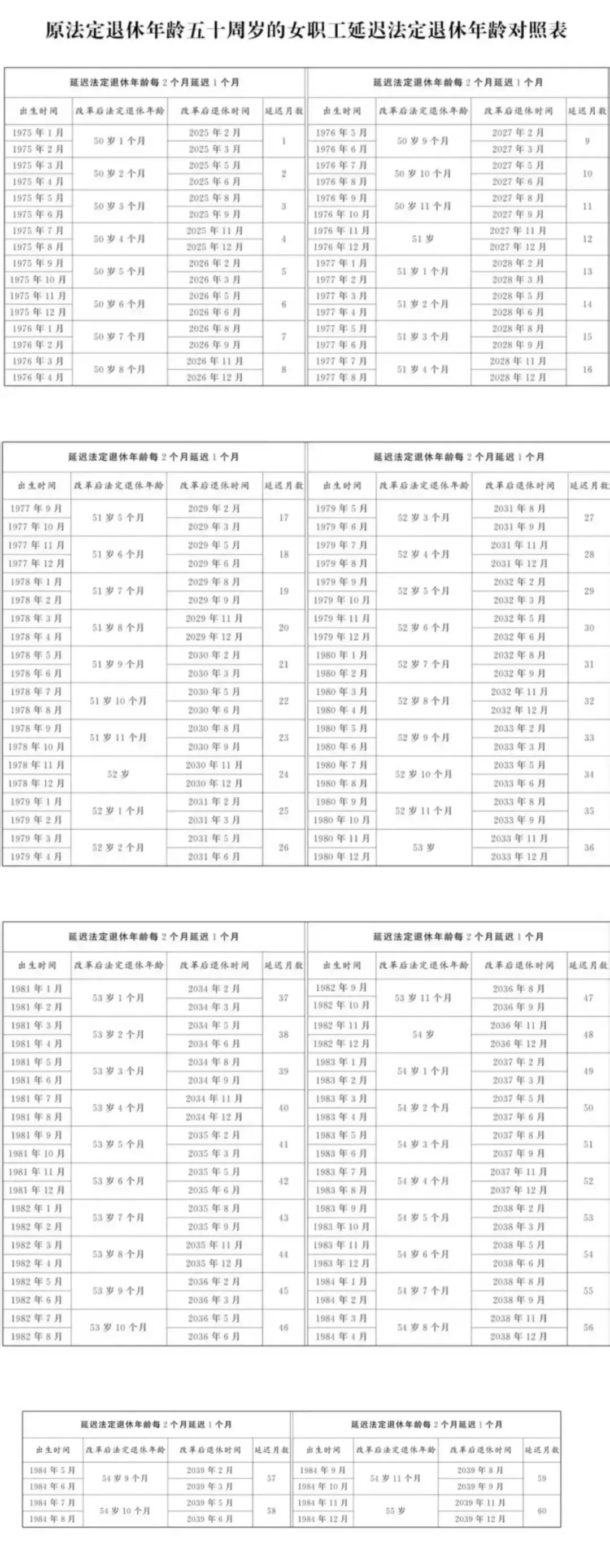 将女职工的法定退休年龄从原五十周岁、五十五周岁分别延迟至五十五周岁、五十八周岁。具体退休年龄见下表👇