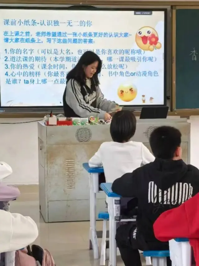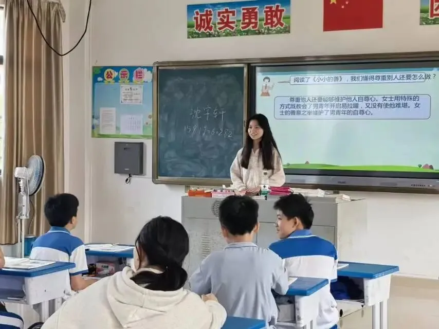 德育课堂温暖而有力量,志愿者们用贴近生活的内容引导孩子们成长。香宜均老师围绕 “读懂彼此的心” 展开教学,通过情境与案例引导学生理解家人、学习有效沟通,化解亲子间的小矛盾;张应杰老师以思维导图与习题训练开展单元复习,帮助学生系统梳理知识、巩固学习成果;周妍老师结合家庭责任、优秀家风等内容开展教学,并组织单元小测强化理解;沈宇轩老师围绕学会尊重、学会反思展开引导,在交流与分享中帮助孩子们涵养品格、向上成长。