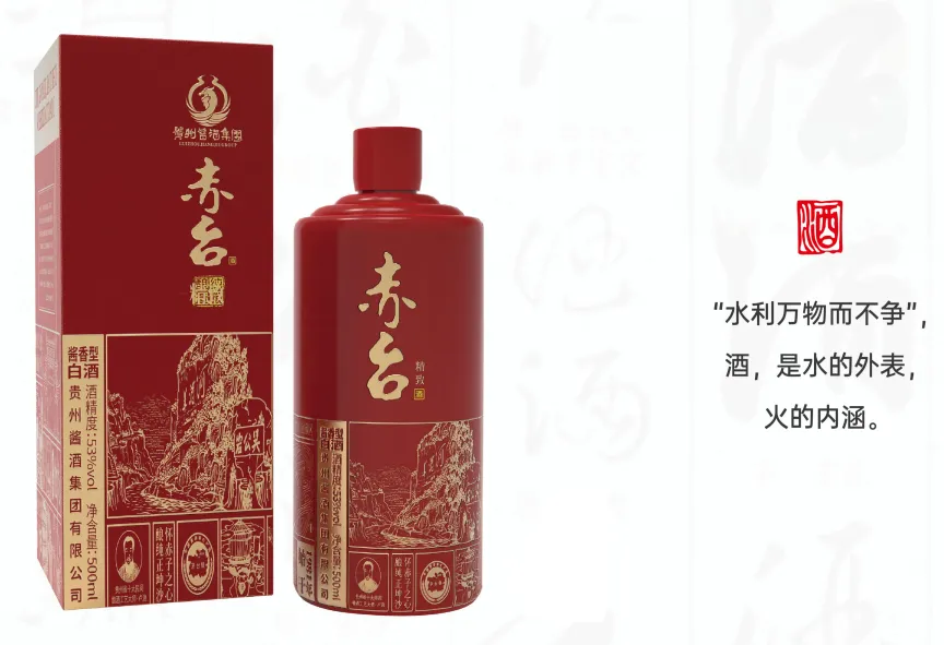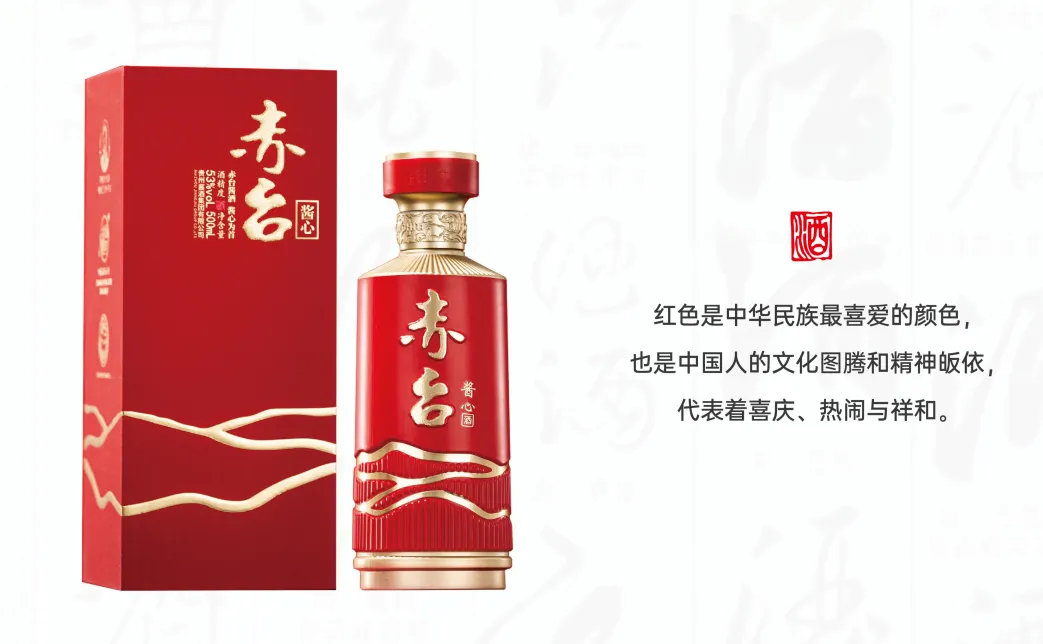 瓶身整体色调选用中国红,中国红沿袭着灿烂辉煌的魏晋脉络:流转着独领风骚的元明清神韵,高度概括着龙的传人生生不息的历史,也印证着赤台酿酒师怀赤子之心,酿纯正坤沙的决心。赤台精致的设计采用“美酒河“图样,贴切地回答了酱酒与水的依存关系。