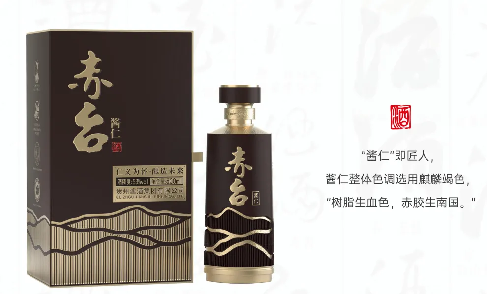 “酱仁"即匠人,酱仁整体色调选用麒麟竭色,"树脂生血色,赤胶生南国。"麒麟竭为粤台地区多年生藤本植物,其树脂凝结如血色,麒麟竭这个名字,也寄寓了一种祥瑞、吉祥、高贵的意境,高雅,气质,适合正式或商务场合。"匠人典范·酱传人间","仁"是儒家思想的核心,意思是仁爱,这也是做人必不可少的品质。其次,新品的取名也融合了酒都仁怀的城市精神:“仁义为怀,酿造未来"象征着赤台广大酱酒核心产区的恒心与决心。