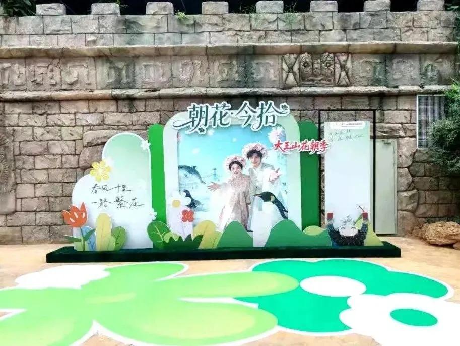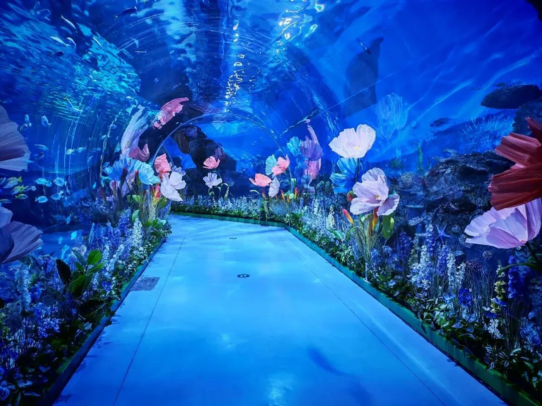 从最终呈现来看,本次项目打造了多个兼具观赏性与互动感的场景点位:有“花神转盘”互动装置,有“朝花今拾”主题打卡点,也有布置于海底隧道内部的沉浸式花艺场景。春花与海洋相映成趣,让整个空间更具层次感与游览体验。