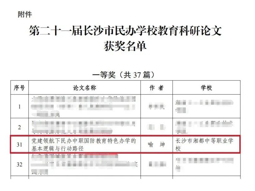 在第二十一届长沙市民办学校教育科研论文评审中,我校党支部书记喻坤撰写的论文:《党建领航下民办中职国防教育特色办学的基本逻辑与行动路径》荣获一等奖!