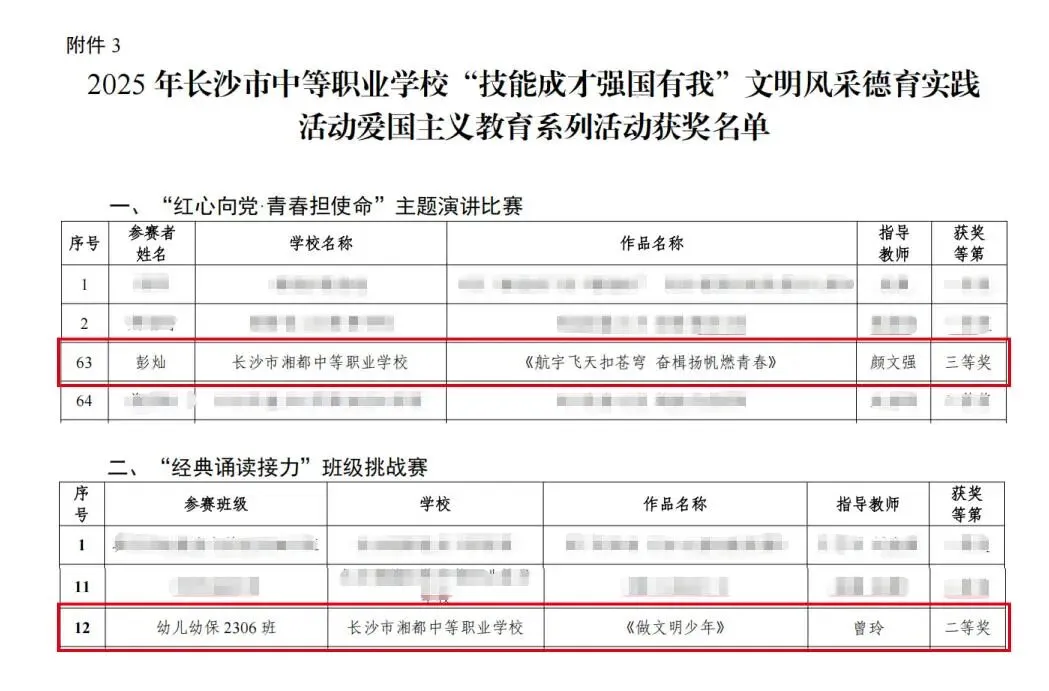 在2025年长沙市“技能成才强国有我”文明风采德育实践活动中,我校师生在经典诵读与主题演讲两个赛项中均取得优异成绩,具体获奖名单如下: