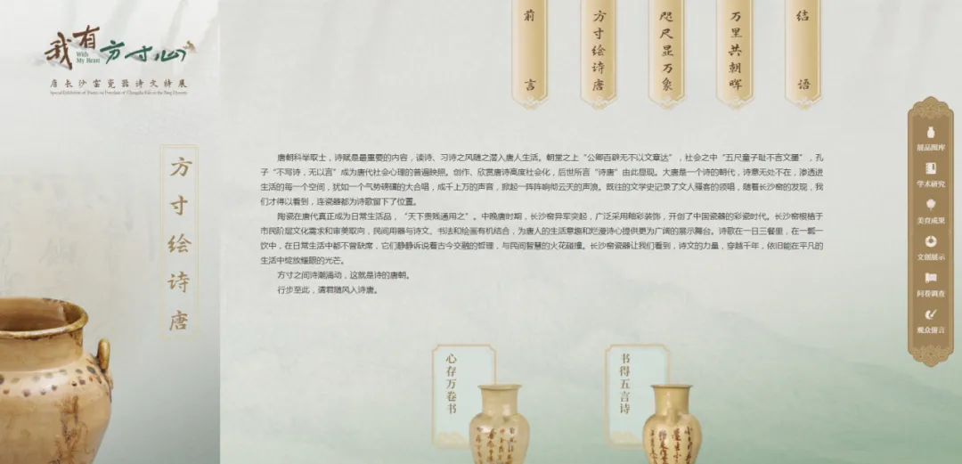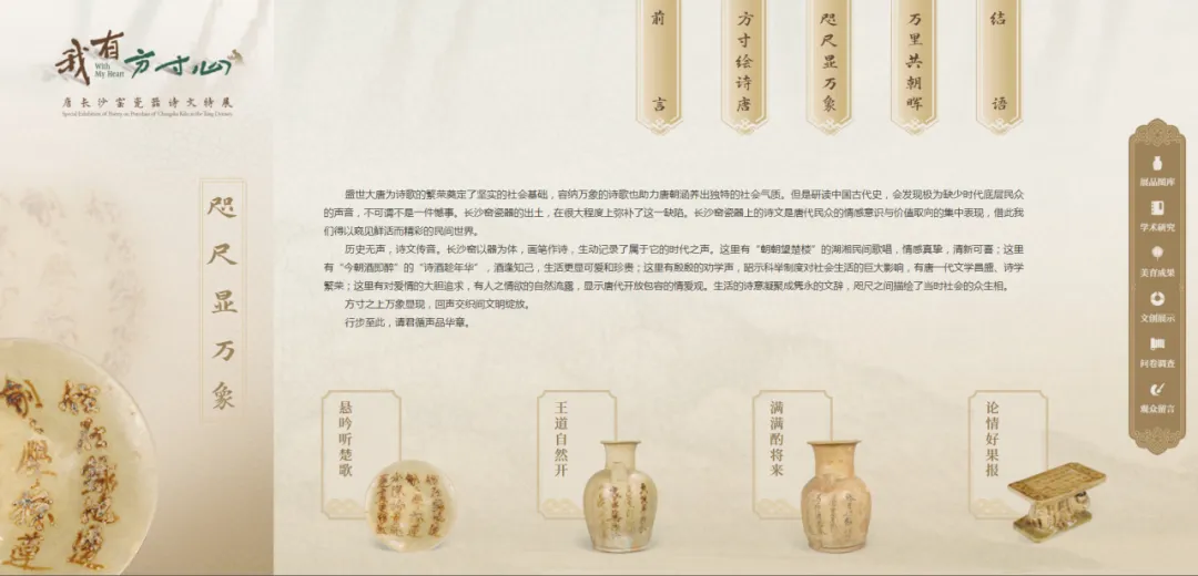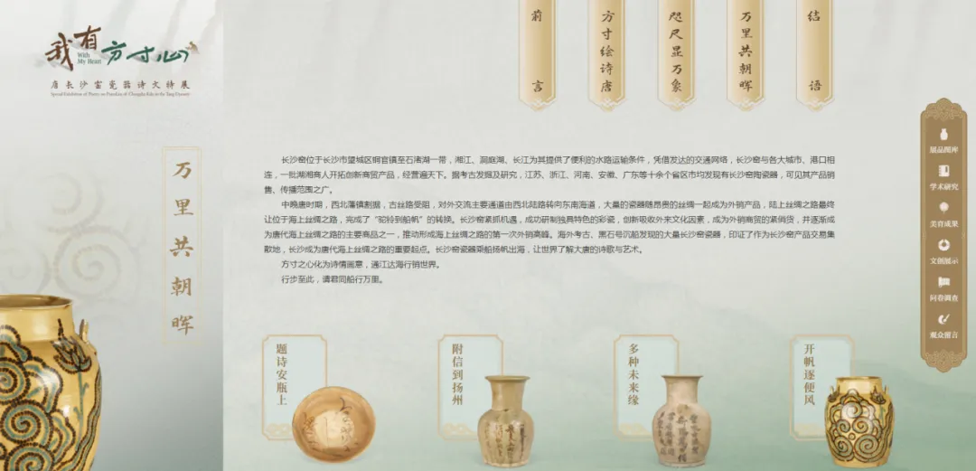 2024年,海上丝绸之路保护和联合申报世界文化遗产城市联盟联席会议在长沙举行,为此,长沙博物馆联合省内外多家文博单位共同举办的“我有方寸心——唐长沙窑瓷器诗文特展”。展览集唐代器物、诗词、书法艺术于一体,分为“方寸绘诗唐”“咫尺显万象”“万里共朝晖”三大章节。
