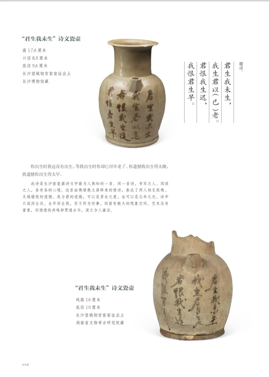 “君生我未生,我生君以(已)老。君恨我生迟,我恨君生早”,这是长沙窑诗文中最广为流传的一首诗。目前已知长沙窑瓷器上的诗歌约有一百三十余首,既有流行的世俗民歌,也有名家文人诗和文学经典题材的创作诗。