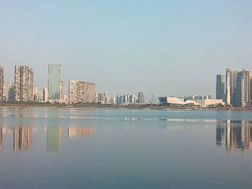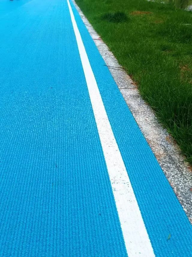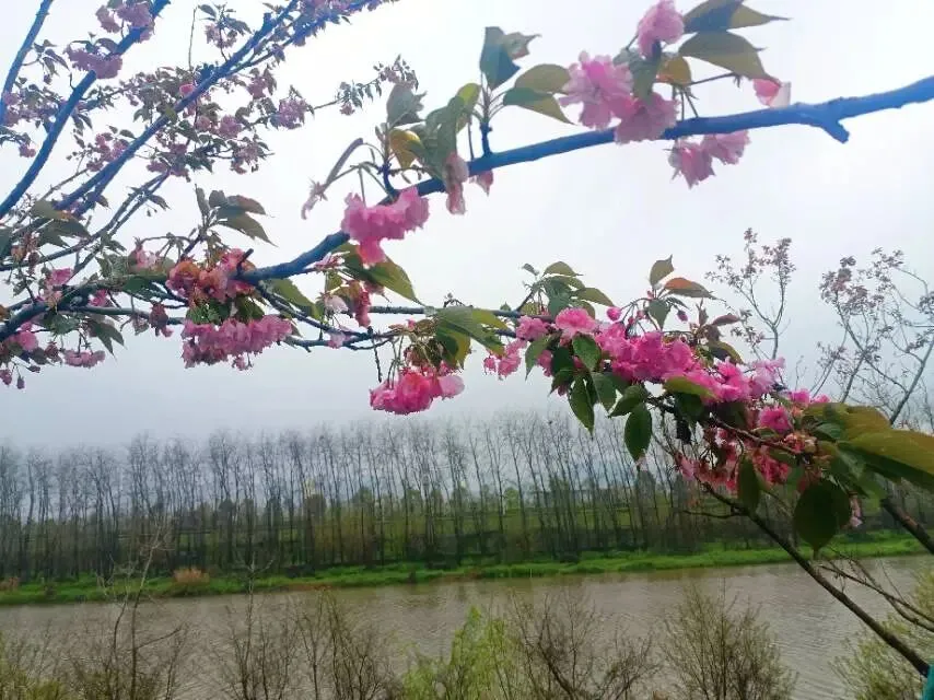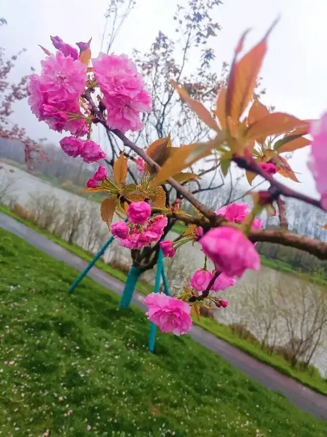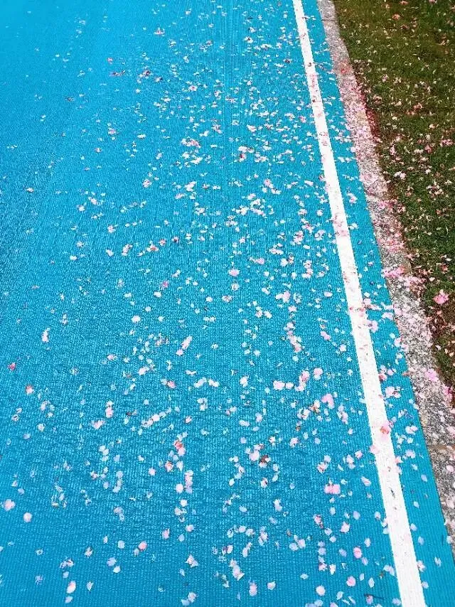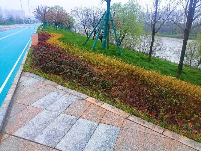 雨丝为沿江步行道镀上了滤镜,彩色的步道如画布一样靓丽清新