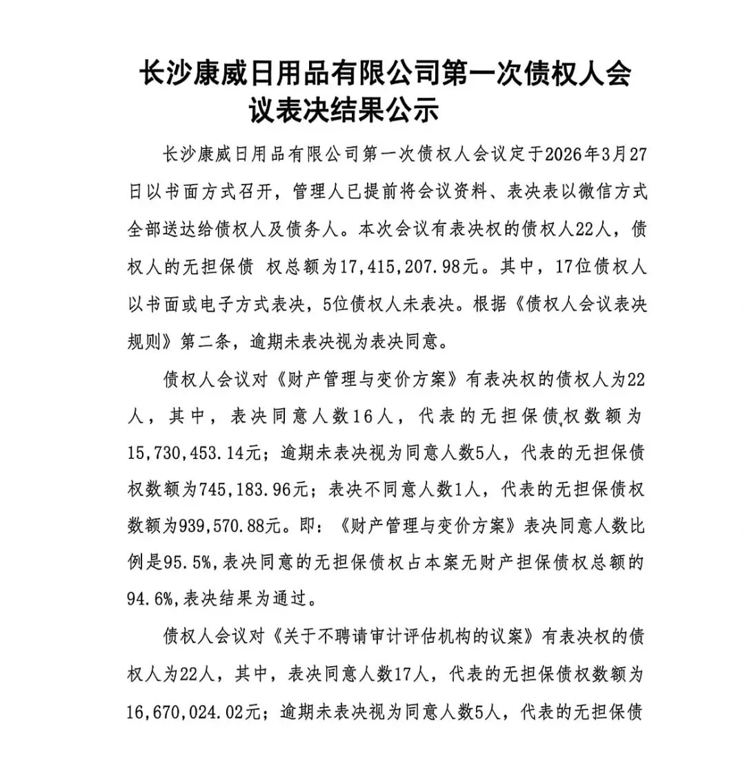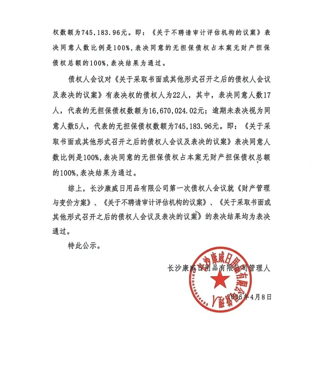 长沙康威日用品有限公司第一次债权人会议表决结果公示