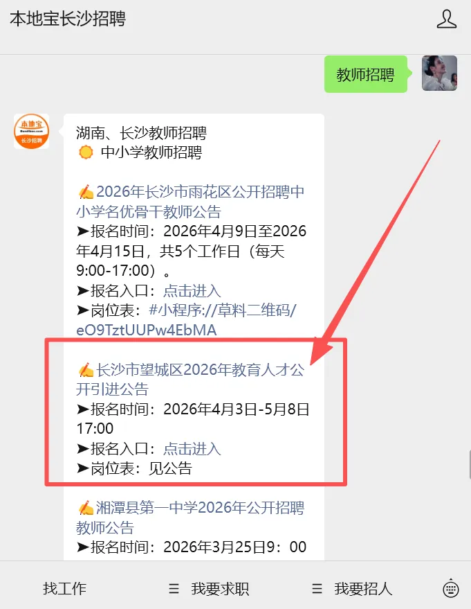 关注【本地宝长沙招聘】,在对话聊天框