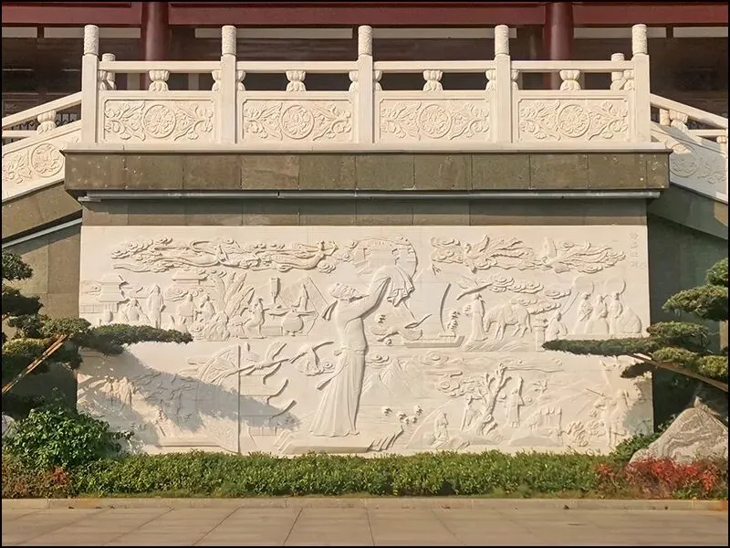 长沙杜甫江阁东侧楼梯基座的汉白玉浮雕,核心寓意是以诗为史,缅怀诗圣,浓缩杜甫晚年的漂泊生涯与家国情怀。浮雕画面主体为杜甫侧身像,双手向北长揖,形象生动;四周场景包括铁甲雄兵、面君陈词、孙妪跪别、月下思忆、伏案奋书等。串联其晚年关键片段,辅以祥云、飞天、仙鹤等元素,兼具唐风美学与文化象征。