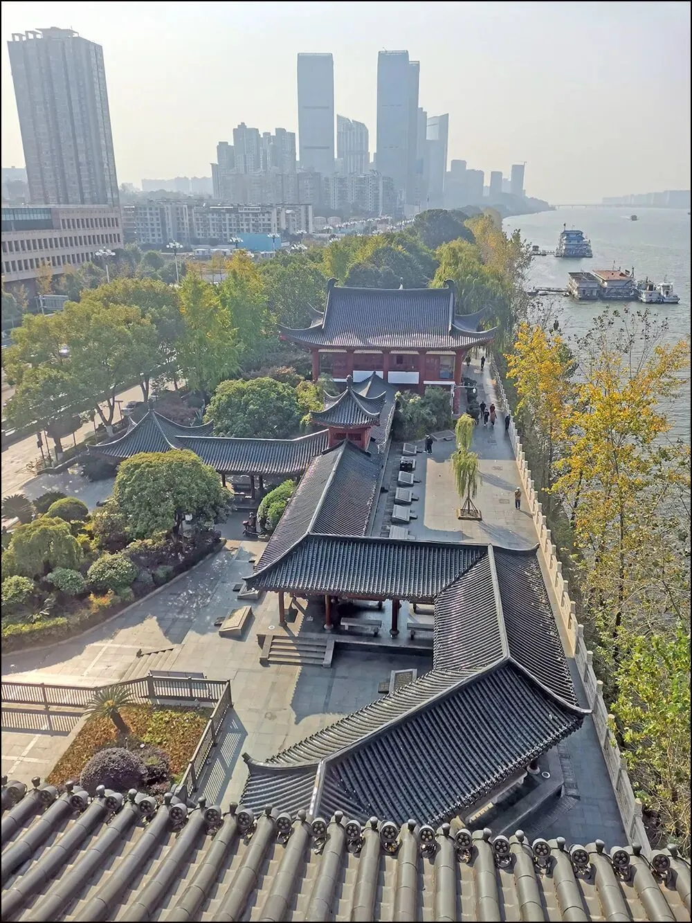 登杜甫江阁要收费的,不过11元的价格只是象征性的。楼中有展厅和茶室,最吸引人的还是楼顶的风光。登上最高层,这里江风劲吹,湘江水泛起白色浪花,江中的橘子洲像是一艘航空母舰,正乘风破浪地前进。橘子洲头处的青年毛泽东头像隐约可见,油然而生伟人当年独立寒秋湘江北去的豪情。