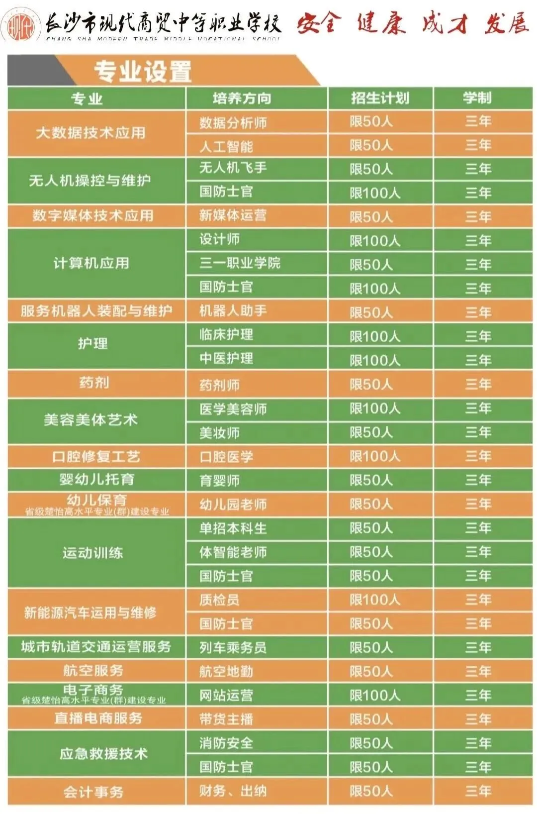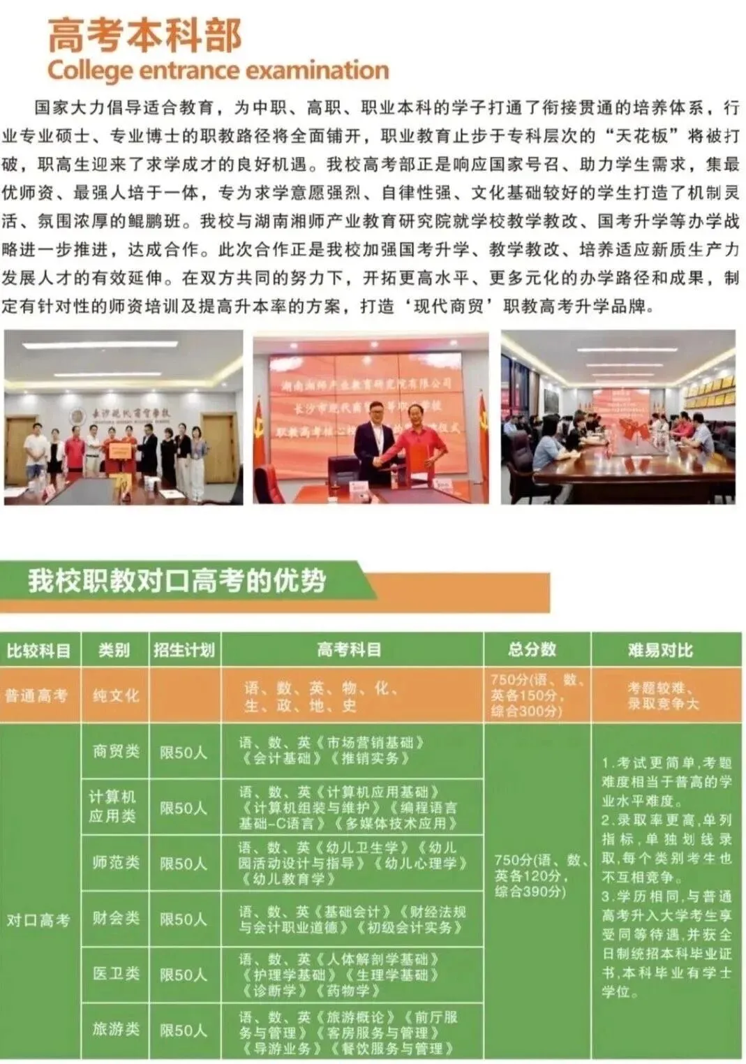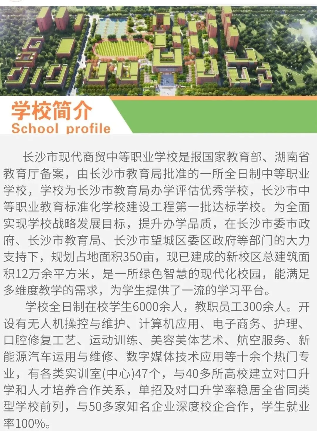 长沙市现代商贸中等职业学校是报国家教育部、湖南省教育厅备案,由长沙市教育局批准的一所全日制中等职业学校,学校为长沙市教育局连续三年办学评估优秀学校,教育标准化学校建设工程第一批达标学校。学校紧跟国家职业教育发展战略,深耕职业教育,拥有职教高考领域的头部资源,在职教高考体系建设、职教高考标准课堂建设方面有着丰富的经验。学校制定有针对性的师资培训及提高升本率的方案,师资队伍强,升学率高。校区总建筑面积近15万余平方米,是一所绿色智慧的现代化校园,有各类实训室50余个,能满足多维度教学的需求,为学生提供一流的学习平台。