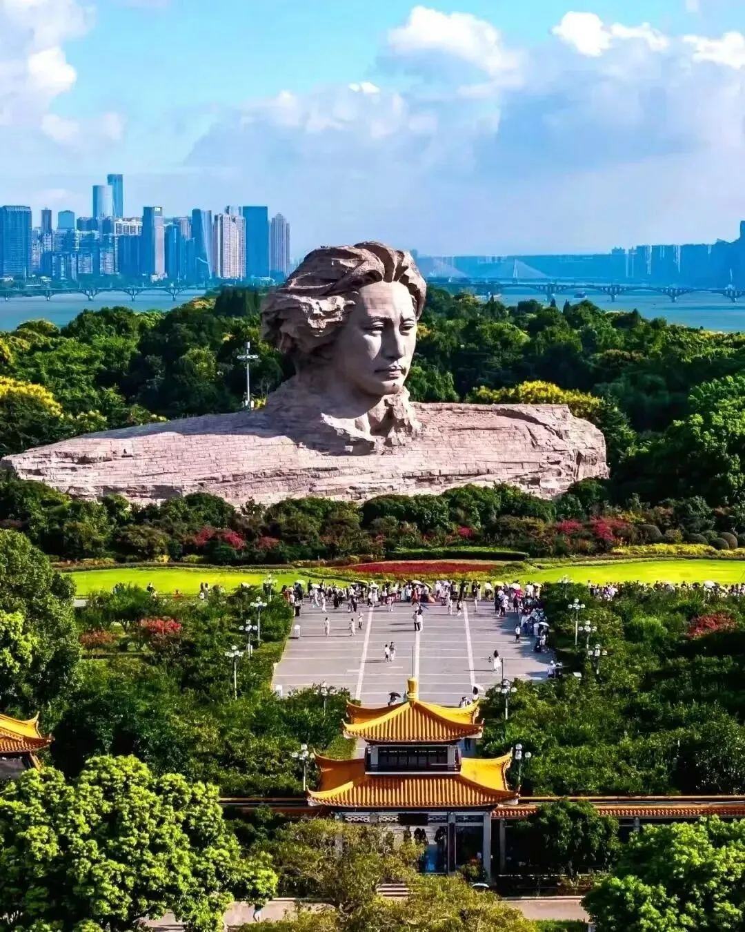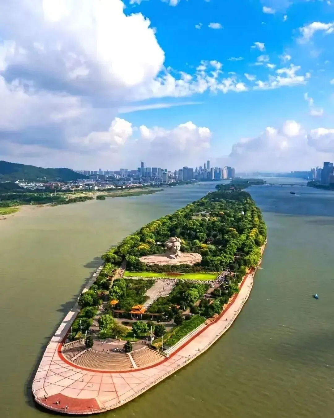 橘子洲头东临长沙城,西望岳麓山,四面环水,绵延数十里被誉为“中国第一洲”。毛泽东青年时期在湖南第一师范大学读书时,常与同学友人到洲头漫步吟涌,后来主席的诗句“独立寒秋,湘江北去,橘子洲头看万山红遍,层林漫染”更让橘子洲头蜚声海内外。