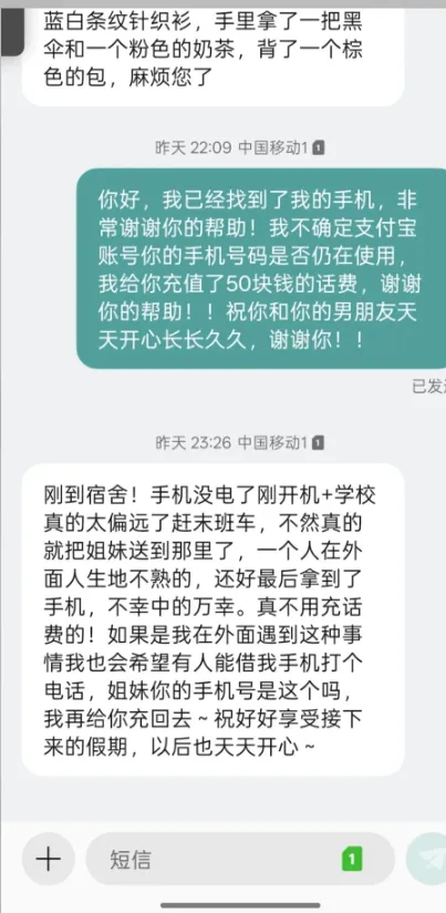 取回手机后,她接到了在大排档外借手机给她的男子的电话——原来,他一直惦记着这个着急的陌生女孩,特意来电询问:“你的手机找到了吗?我们一直很担心你。”此外,为了向在公交站偶遇的女生表达感谢,6日,小姜往对方的手机号里充值50元话费,“不过,她得知后,又将这50元充还回了我的手机里。”