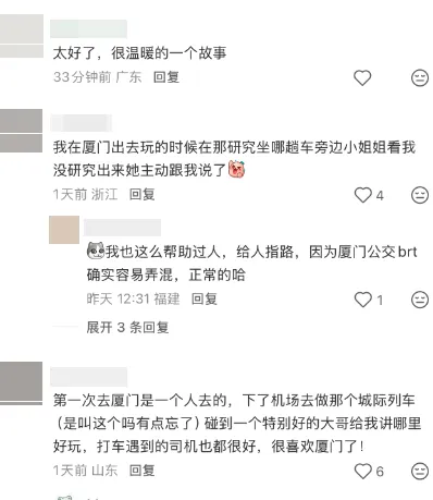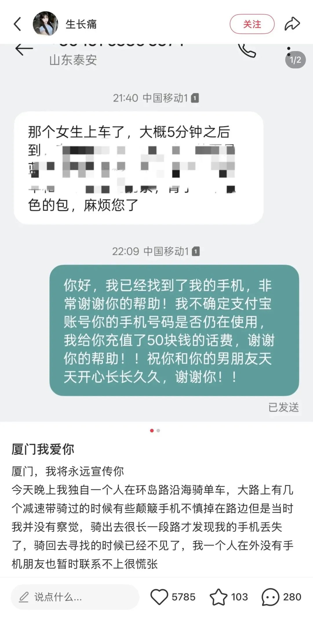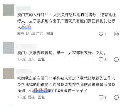 小姜注意到,捡到手机的阿姨、大排档外的男子都来自厦门,公交车站的女大学生是山东人,网约车司机来自漳州……“一台丢失的手机,让我感受到不同地方的人的温暖,这趟旅行值得,希望善良的人一直会被世界善待。”