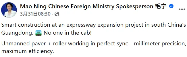 3月31日,外交部新闻司司长、新闻发言人毛宁在社交平台发布视频,点赞广东汕梅高速改扩建项目中三一无人摊压机群的智能施工表现,向全球展示了中国交通建设数字化、智能化转型最新成果。