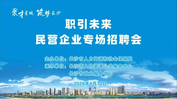 4 月 10 日(周五)上午,由长沙市人力资源和社会保障局主办的“职引未来——民营企业专场招聘会”将在长沙市人力资源市场(长沙市人社局一楼)火热开场!
