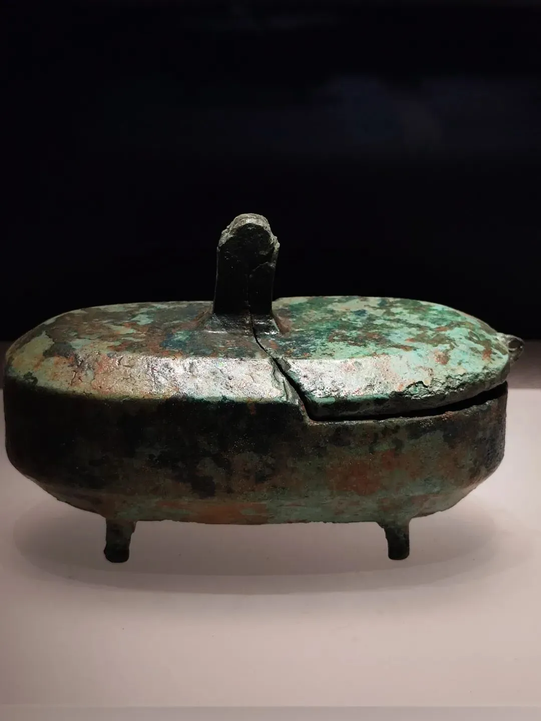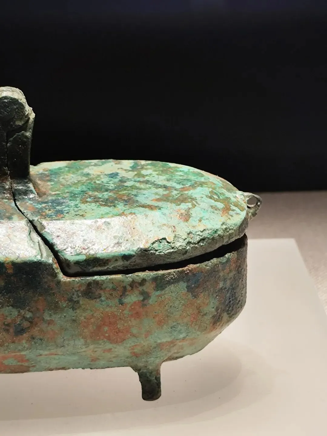 整体为青铜铸造,器身呈椭圆形盒状,底部承三足,盖顶设提钮,盖身以活轴连接,可开合翻转。铜灯表面保留了汉代青铜铸造的原始工艺痕迹,历经两千余年形成自然的铜绿锈层,器型规整、结构稳固,体现了西汉时期南方青铜冶铸的成熟水准。