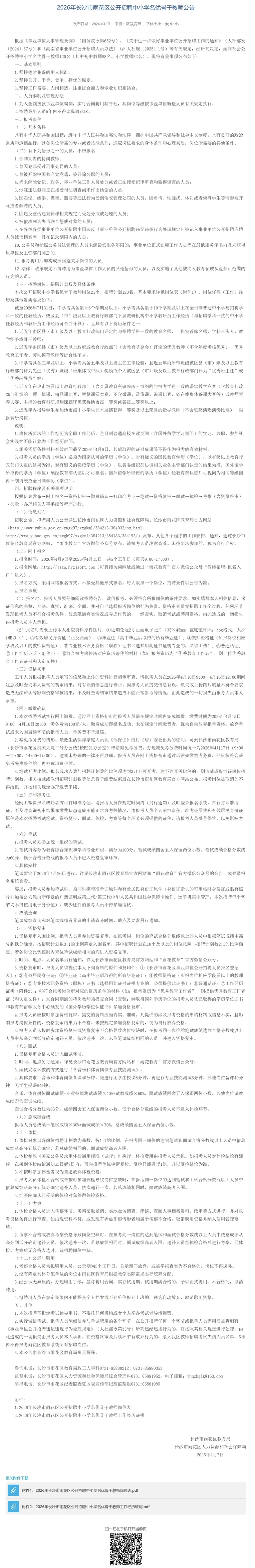 2026年长沙市雨花区公开招聘中小学名优骨干教师公告