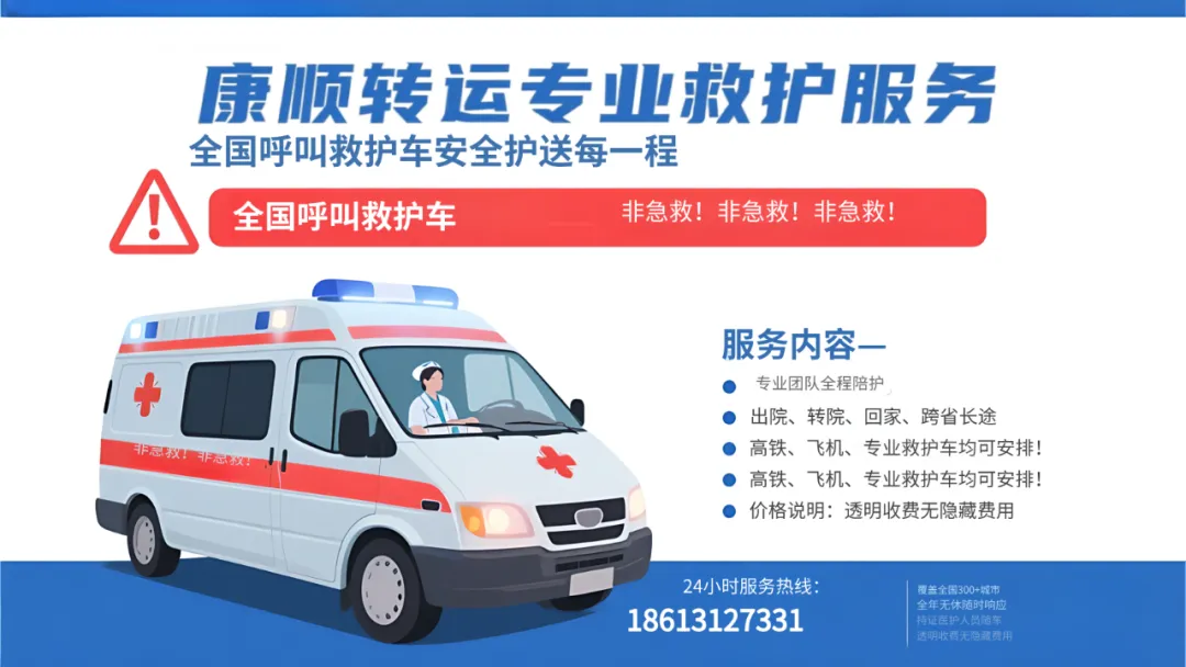 温馨提示:如遇突发心脏病、严重创伤、大出血等危及生命的紧急情况,请立即拨打 120 急救电话。康顺转运为非急救医疗转运服务,为病情稳定患者提供专业护送。