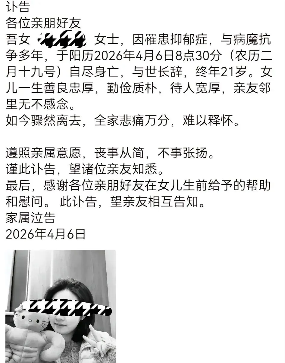 再看看另外一个意外,一个女孩子,把自己围困在一个环境之中,走不出来,形成抑郁,最终抑郁而终。
