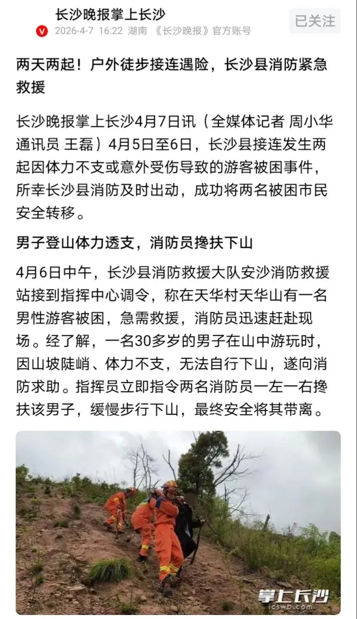 再看看长沙晚报报道这则新闻,如果不是自己坚定切断爬山的执念,让消防队员救自己下山,很有可能也是一个意外,这说明这两个人还是有敬畏之心的。