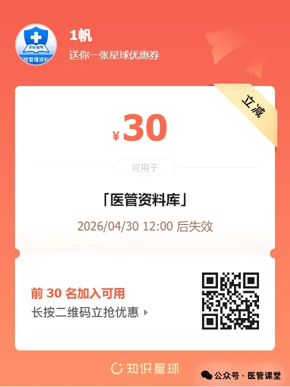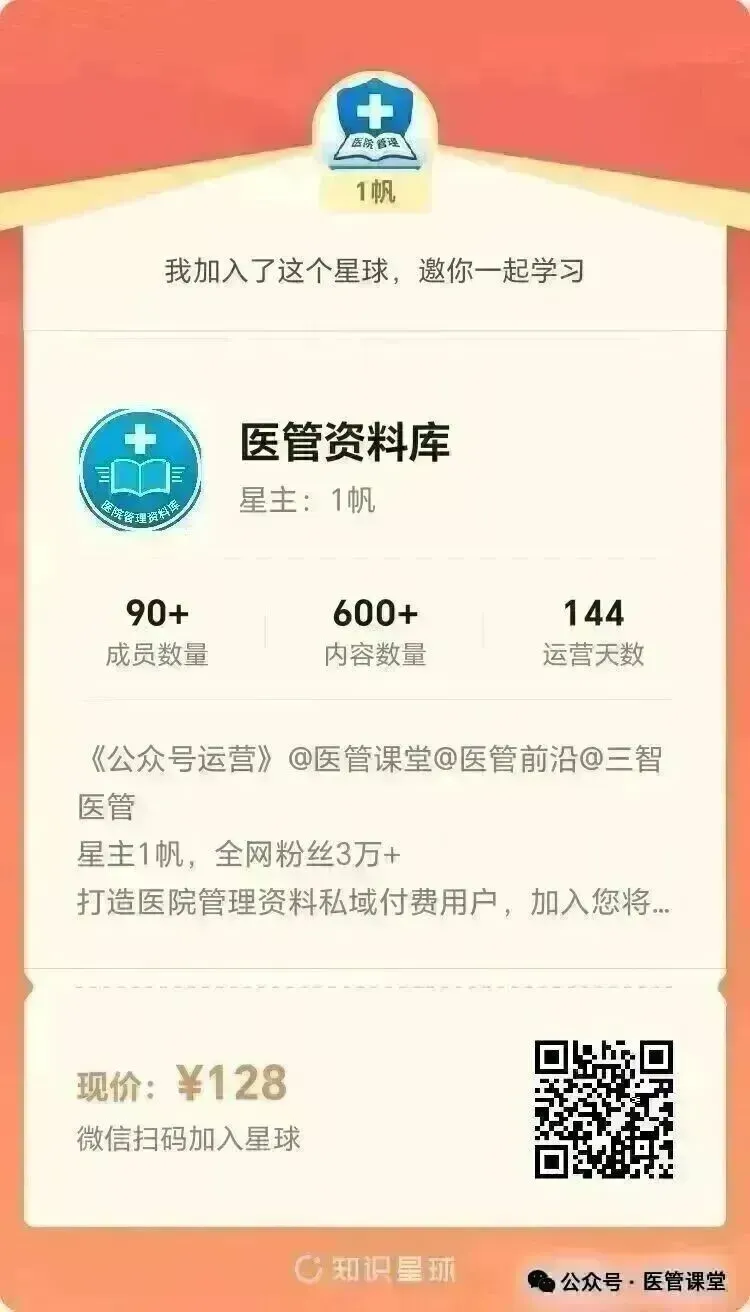 【医管资料库】星球:侧重发布医院管理制度、课件、电子书等各类资料合集,内容较泛但信息量大,有意的可扫码加入。会员资源持续更新,目前累计更新资源500+,加入之日一年内有效!优秀同行同频学习,早加入,早受益!