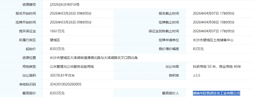 上个月,[2026]长沙市016号地块挂网,虽然拍卖截止日是在今天(4月8日),但早在3月26日,就有公司就迫不及待地出价了。今天,这个出价的公司揭晓--湖南华廷筑邦住宅工业有限公司,该公司就是湖南巨星投资集团的一员。这是大泽湖片区首宗成交的科研商务用地,占据大泽湖一线湖景与江景优势,总出让面积约3.06万㎡,计容建面约10.7万㎡,规划打造巨星集团科创总部大楼。巨星集团总资产超 50 亿元,实力雄厚,拥有科技发明专利5000余项,授权发明专利3000余件,曾多次获省技术发明一等奖等荣誉,是一家以科技创新为核心竞争力的综合性集团企业。此次布局并非巨星集团首次进驻望城,而是企业持续深耕区域、加码产业落地的重要一步。根据之前的签约信息,落子大泽湖片区的巨星集团科创总部项目将投资15亿元(包含土地款8303万元),在大泽湖片区打造一栋150米超高层科创总部,集科创总部、总部创业基地、高端商业综合体于一体,定位为“中国专利大厦、全国留学生创业园”,计划引入高端科技研发人才2000人以上,构建全链条科技创新生态。该项目已列入2026年长沙市重点建设项目,年度计划投资1.5亿元,目前已顺利摘地,正式开工应该也很快了,恭喜大泽湖片区!大泽湖作为长沙副中心、湘江新区总部经济区、全球研发中心城市核心基地,此前已落地澳优、中交等总部项目。如今巨星科创总部正式进驻,不仅是大泽湖从规划蓝图走向价值兑现的关键一步,更进一步完善了片区科研商务功能,让片区坐稳长沙总部经济新高地,为长沙全球研发中心城市建设再添硬核支撑。