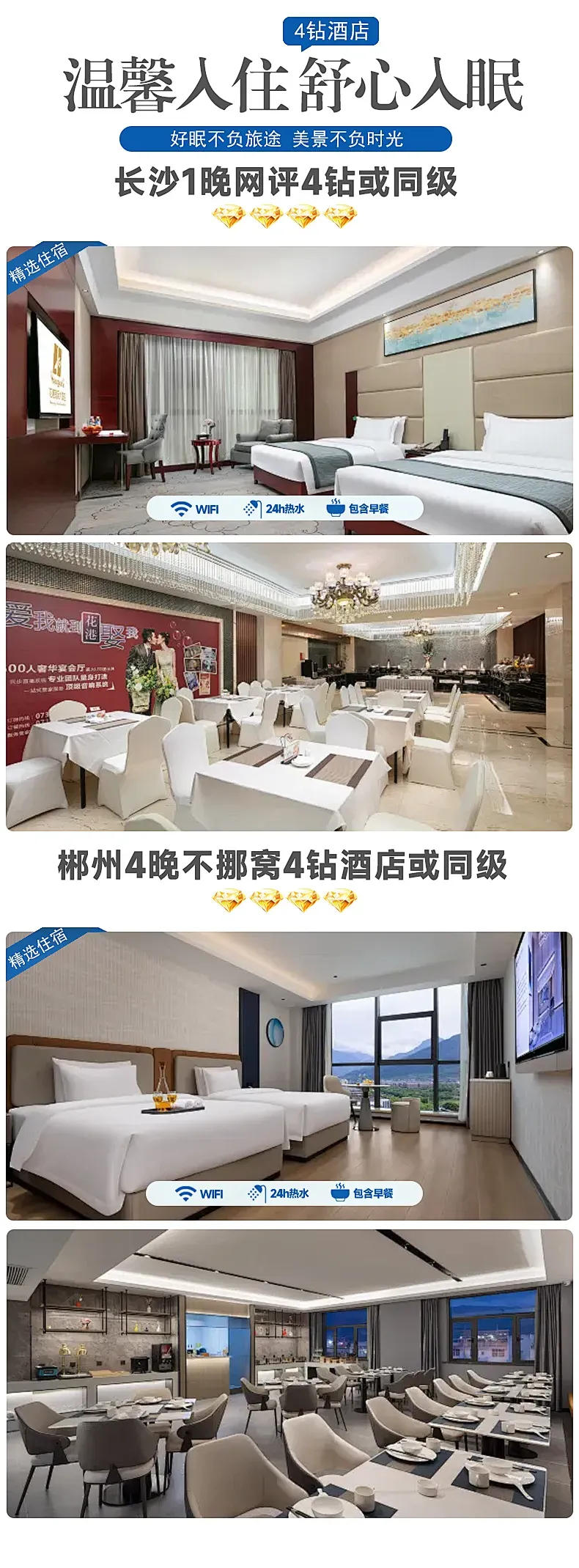 【住宿安排】长沙2晚4钻酒店+郴州3晚4钻酒店;