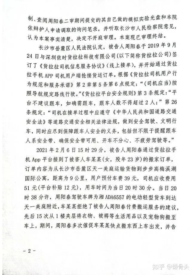 长沙市岳麓区人民法院认定,被告人周阳春于2019年9月24日与深圳依时货拉拉科技有限公司(以下简称货拉拉公司)签订了《货拉拉司机信息服务协议》(线上接单),并开始通过货拉拉手机APP司机用户端抢接货运订单。根据《货拉拉司机用户行为规范和服务承诺》第2章第5条第6点规定:“(司机应当)按照导航规定路线行驶。”《货拉拉平台安全规则》第3条规定:“平台不建议跟车,如确需跟车,跟车人数不得超过2人;”第26条规定:“司机在接单过程中应遵守《中华人民共和国道路交通安全法》等道路交通安全相关法律法规,做到安全驾驶、文明行车,同时应尽到保障跟车人安全的义务,包括但不限于提醒跟车人系安全带、确保安全带可用、开车不分心、不疲劳驾驶等。”2021年2月6日15时29分,被告人周阳春通过货拉拉手机App平台接到了被害人车某某(女,殁年23岁)的搬家订单,订单内容为从长沙市岳麓区天一美庭运输货物到步步高梅溪湖国际公寓,距离为9公里,用户预付车费39元,司机应收费用51元(平台补贴12元),用车时间为当日20时30分。当日20时38分许,周阳春驾驶车牌为湘ADA6557的电动轻型货车到达天一美庭附近,车某某拒绝了被告人周阳春付费搬运服务的建议,先后15次从1楼夹层将衣物、被褥等生活用品以及宠物狗搬至车上,期间,周阳春多次催促车某某快点搬东西上车出发,并告知她,司机等待时问超过40分钟将额外收取费用,车某某在临近40分钟时搬完物品,因这个订单耗时长、赚钱少,周阳春对车某某心生不满。