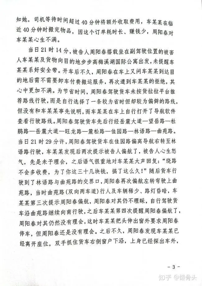当日21时14分,被告人周阳春搭载坐在副驾驶位置的被害人车某某及货物向目的地步步高梅溪湖国际公寓出发,未提醒车某某系好安全带。开车后不久,周阳春在车上又问车某某到达目的地后需不需要卸车付费搬运服务,再次遭到车某某的拒绝,其心中更加不满。为节省时间,周阳春驾驶货车未按货拉拉平台推荐路线行驶,而是自行选择了一条较为省时但却较为偏僻的路线,但没有和车某某事先说明,而车某某在车上自行打开了导航软件查看行驶路线。周阳春驾驶货车先后行经岳麓大道—望岳路—杜鹃路—岳麓大道—旺龙路—麓松路—佳园路—林语路—曲苑路。当日21时29分许,周阳春驾驶货车在佳园路偏离导航右转至林语路行驶,车某某发现后两次提示被告人偏航了,被告人心生怒气,先是未予理会,之后语气很重地对车某某大声回复:“绕路不会多收费,为了你这三十几块钱,搞了这么久!”随后货车行驶到了林语路与曲苑路的交界口,周阳春再次偏航左转弯驶上曲苑路,当时曲苑路(双向两车道)行人及车辆稀少、路灯昏暗,车某某第三次提示周阳春偏航,周阳春对其仍不理睬,自行驾驶货车沿曲苑路继续向南行驶,之后车某某第四次提醒周阳春偏航了,周阳春对其仍然没有理会,这时车某某把头伸出窗外要求周阳春停车,但周阳春还是没有理会。之后不久,周阳春发现车某某已经离开座位,双手抓住货车右侧窗户下沿,上身已经探出车外,当时车速约为33公里/小时。见此情形,周阳春松开油门,打开双闪灯,仍然继续行驶,后车某某从车窗坠落。此时周阳春制动停车,时间约为当日21时30分许。