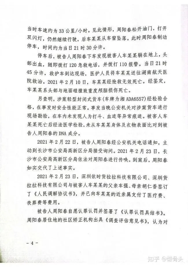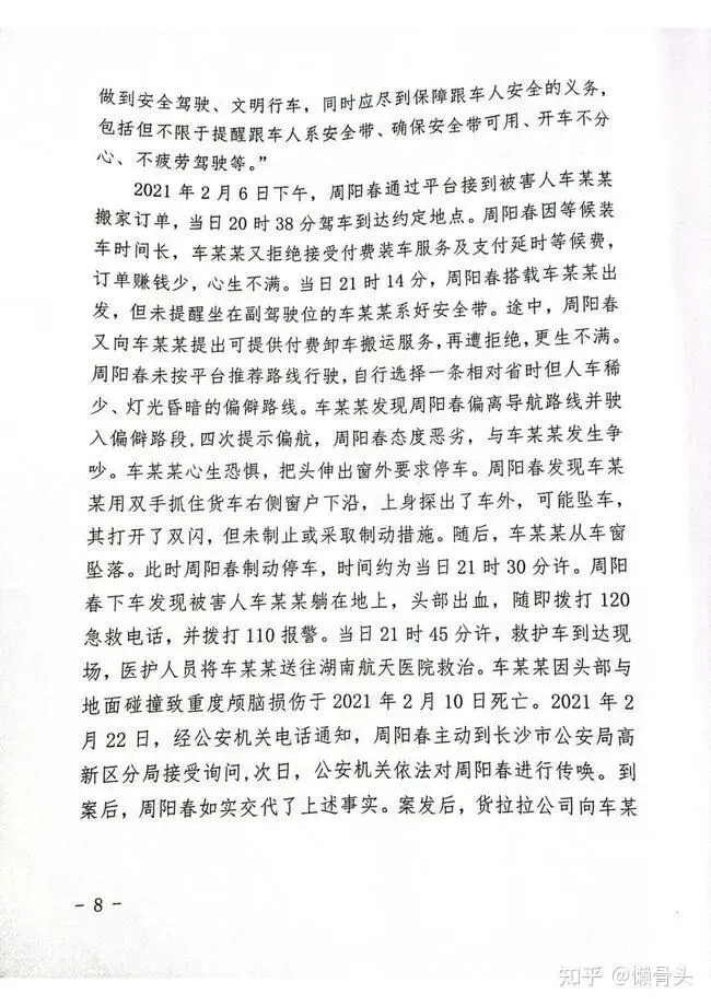 2021年2月6日下午,周阳春通过平台接到被害人车某某搬家订单,当日20时38分驾车到达约定地点。周阳春因等候装车时问长,车某某又拒绝接受付费装车服务及支付延时等候费,订单赚钱少,心生不满。当日21时14分,周阳春搭载车某某出发,但未提醒坐在副驾驶位的车某某系好安全带。途中,周阳春又向车某某提出可提供付费卸车撤运服务,再遭拒绝,更生不满。周阳春未按平台推荐路线行驶,自行选择一条相对省时但人车稀少、灯光昏暗的偏僻路线。车某某发现周阳春偏离导航路线并驶入偏僻路段,四次提示偏航,周阳春态度恶劣,与车某某发生争吵。车某某心生恐惧,把头伸出窗外要求停车。周阳春发现车某某用双手抓住货车右侧窗户下沿,上身探出了车外,可能坠车,其打开了双闪,但未制止或采取制动措施。随后,车某某从车窗坠落。此时周阳春制动停车,时间约为当日21时30分许。周阳春下车发现被害人车某某躺在地上,头部出血,随即拨打120急救电话,并拨打110报警。当日21时45分许,救护车到达现场,医护人员将车某某送往湖南航天医院救治。车某某因头部与地面碰撞致重度颅脑损伤于2021年2月10日死亡。2021年2月22日,经公安机关电话通知,周阳春主动到长沙市公安局高新区分局接受询问,次日,公安机关依法对周阳春进行传唤。到案后,周阳春如实交代了上述事实。案发后,货拉拉公司向车某某父母支付了医疗费、丧葬费等费用。