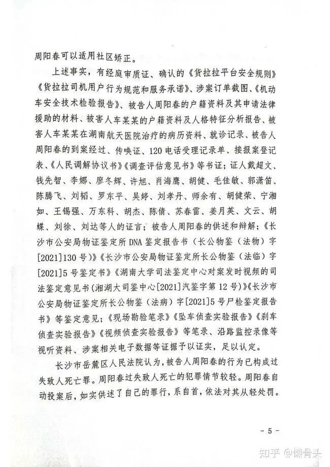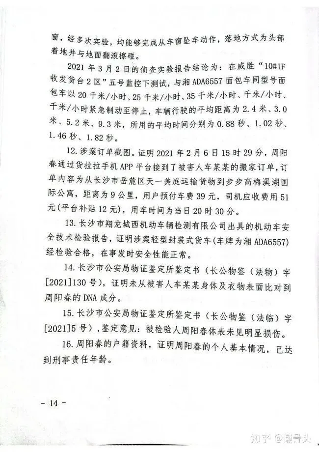 上述事实,有经庭审质证、确认的《货拉拉平台安全规则》《货拉拉司机用户行为规范和服务承诺》、涉案订单截图、《机动车安全技术检验报告》、被告人周阳春的户籍资料及其申请法律援助的材料、被害人车某某的户籍资料及人格特征分析报告、被害人车某某在湖南航天医院治疗的病历资料、就诊记录、被告人周阳春的到案经过、传唤证、120电话受理记录单、接报案登记表、《人民调解协议书》《调查评估意见书》等书证;证人戴超文、钱先智、李娜、廖冬辉、许旭、肖海鹰、胡健、毛佳敏、郭潇笛、陈腾飞、刘韬、罗东平、吴婷、刘孝丹、师余有、胡健荣、宁湘如、王锡强、万东科、胡杰、陈倩、苏春雷、姜月英、文云、胡蝶、刘徐、刘达等人的证言;被告人周阳春的供述和辩解;《长沙市公安局物证鉴定所DNA鉴定报告书(长公物鉴(法物)字[2021]130号)》《长沙市公安局物证鉴定所长公物鉴(法临)字[2021]5号鉴定书》《湖南大学司法鉴定中心对案发时视频的司法鉴定意见书(湘湖大司鉴中心[2021]汽鉴字第12号)》《长沙市公安局物证鉴定所长公物鉴(法病)字[2021]5号尸检鉴定报告书》等鉴定意见;《现场勘验笔录》《坠车侦查实验报告》《刹车侦查实验报告》《视频侦查实验报告》等笔录、沿路监控录像等视听资料、涉案相关电子数据等证据予以证实,足以认定。