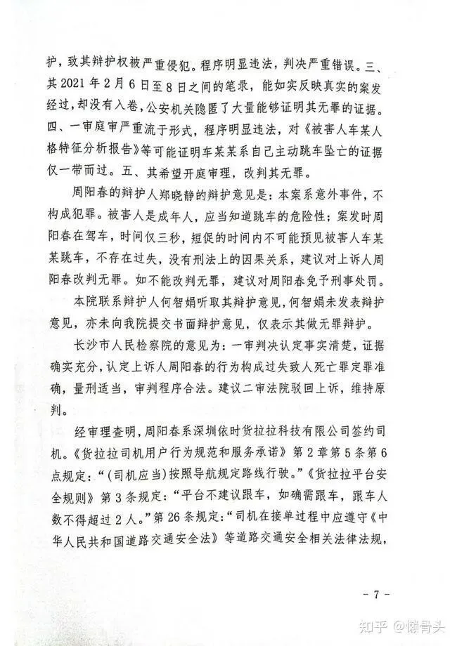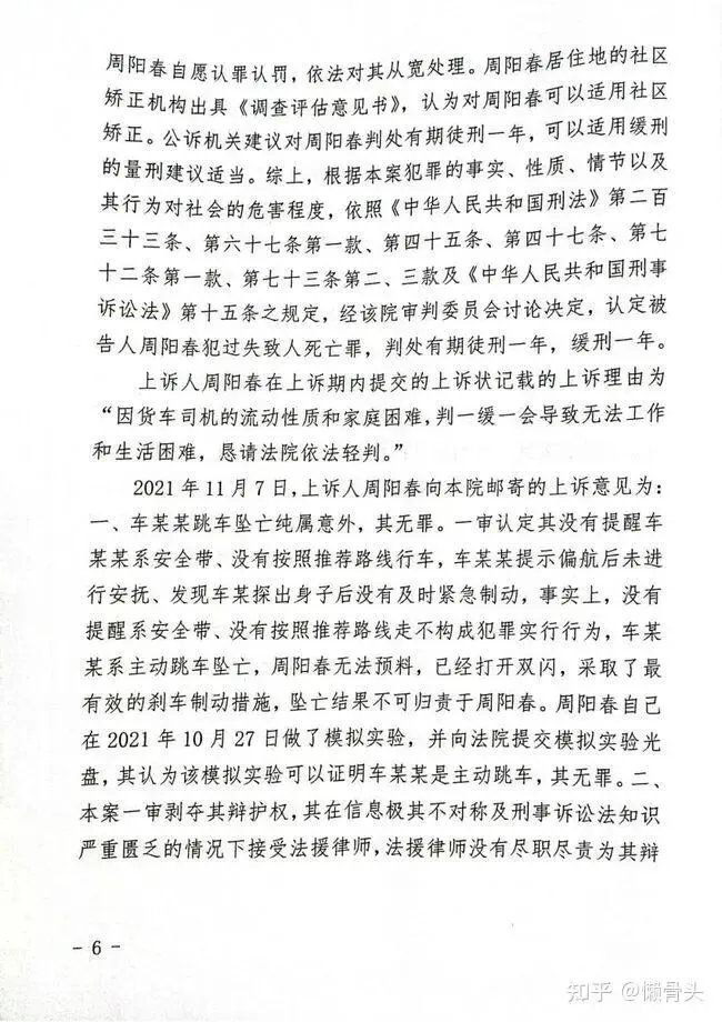 2021年11月7日,上诉人周阳春向本院邮寄的上诉意见为:一、车某某跳车坠亡纯属意外,其无罪。一审认定其没有提醒车某某系安全带、没有按照推荐路线行车,车某某提示偏航后未进行安抚、发现车某探出身子后没有及时紧急制动,事实上,没有提醒系安全带、没有按照推荐路线走不构成犯罪实行行为,车某某系主动跳车坠亡,周阳春无法预料,已经打开双闪,采取了最有效的刹车制动措施,坠亡结果不可归责于周阳春。周阳春自己在2021年10月27日做了模拟实验,并向法院提交模拟实验光盘,其认为该模拟实验可以证明车某某是主动跳车,其无罪。二、本案一审剥夺其辩护权,其在信息极其不对称及刑事诉讼法知识严重匮乏的情况下接受法援律师,法援律师没有尽职尽责为其辩护,致其辩护权被严重侵犯。程序明显违法,判决严重错误。三、其2021年2月6日至8日之间的笔录,能如实反映真实的案发经过,却没有入卷,公安机关隐匿了大量能够证明其无罪的证据。四、一审庭审严重流于形式,程序明显违法,对《被害人车某人格特征分析报告》等可能证明车某某系自己主动跳车坠亡的证据仅一带而过。五、其希望开庭审理,改判其无罪。