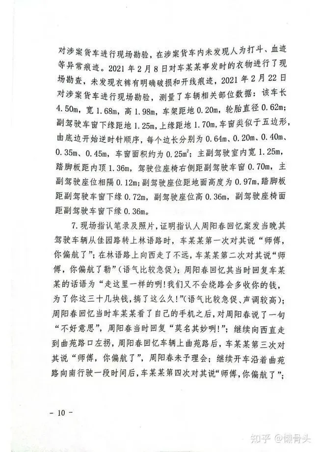 7. 现场指认笔录及照片,证明指认人周阳春回忆案发当晚其驾驶车辆从佳园路转上林语路时,车某某第一次对其说“师傅,你偏航了”;在林语路上向西走了不远,车某某第二次对其说“师傅,你偏航了勒”(语气比较急促);周阳春回忆其当时回复车某某的话语为“走这里一样的咧!我们又不会绕路会多收你的钱,为了你这三十几块钱,搞了这么久!”(语气比较急促、声调较高);周阳春回忆当时车某某看了自己的手机之后,对周阳春说了一句“不好意思”,周阳春当时回复“莫名其妙咧!”;继续向西直走到曲苑路口左拐,周阳春回忆车辆上曲苑路后,车某某第三次对其说“师傅,你偏航了”,周阳春未予理会;继续开车沿着曲苑路向南行驶一段时间后,车某某第四次对其说“师傅,你偏航了”,周阳春仍然未予理睬,其看见车某某将头部伸出车窗外,双手撑在车窗下沿,说了一句“停车咯”,此时周阳春仍未采取紧急刹车的措施;待其第二次看向车某某时,车某某已经从车窗坠下车,此时其立即刹车。
