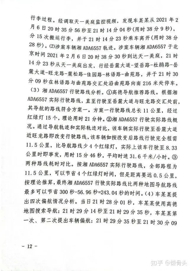10. 长沙市公安局商新区分局刑侦大队关于2021年2月6日周阳春过失致人死亡案视频侦查报告书。证明:(1)车某某搬运行李过程。经调取天一美庭监控视频,发现车某某从2021年2月6日20时35分56秒至21时14分04秒(用时38分9秒),分15次搬运行李,并于21时14分23秒乘车离开(用时38分28秒)。⑵涉案车辆湘ADA6557轨迹。涉案车辆湘ADA6557于北京时间2021年2月6日20时38分30秒到达天一美庭,21时14分23秒从天一美庭出发,行经岳麓大道—望岳路—杜鹃路—岳麓大道—旺龙路—麓松路—佳园路—林语路—曲苑路,并于21时30分09秒在林语路与曲苑路交汇处沿曲苑路向南216米处停车。(3)湘ADA6557行驶路线分析。①高德导航推荐路线。根据湘ADA6557实际行驶路线,直至行驶至岳藤大道与旺龙路交汇处前,其导航的路线符合方案一。方案一行驶路线总长11公里,经过红绿灯15个,理论用时21分钟。②湘ADA6557行驶实际路线概况。通过导航轨迹和实际轨迹对比,该车辆实际行驶至岳麓大道近旺龙路即改变行驶路线,该车辆如按改变后路线行驶完全程需11.5公里,比导航路线少4个红绿灯,实际上该车行驶至8.33公里时即事发,用时15分46秒,平均时速31.6千米/小时。③两种路线耗时对比。按湘ADA6557实际行驶路线,全部路程为11.5公里,可以节省4个红绿灯时间,但是距离要远0.5公里,按理论推算,最终湘ADA6557行驶实际路线,比两种地图导航路线最多可以节省300秒-56.96秒=243.04秒的时间。(4)车某某提出四次偏航情况分析。当日21时28分01秒,车某某使用高德地图搜索导航;21时29分14秒至21时29分35秒,车某某第一次、第二次提出车辆偏航;21时29分35秒至21时30分09秒,车某某第三次、第四次提出车辆偏航。