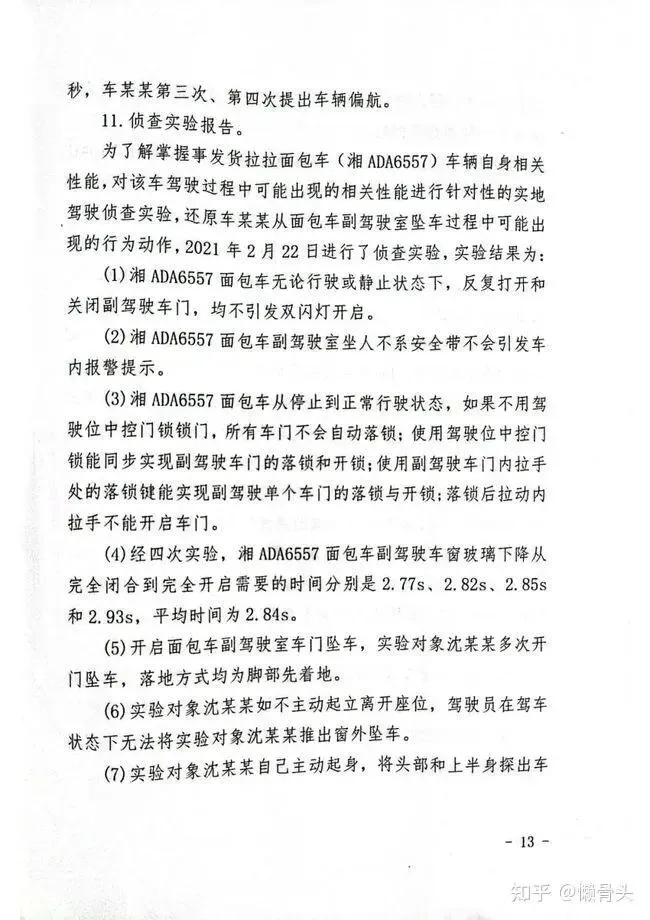 为了解掌握事发货拉拉面包车(湘ADA6557)车辆自身相关性能,对该车驾驶过程中可能出现的相关性能进行针对性的实地驾驶侦查实验,还原车某某从面包车副驾驶室坠车过程中可能出现的行为动作,2021年2月22日进行了侦查实验,实验结果为: